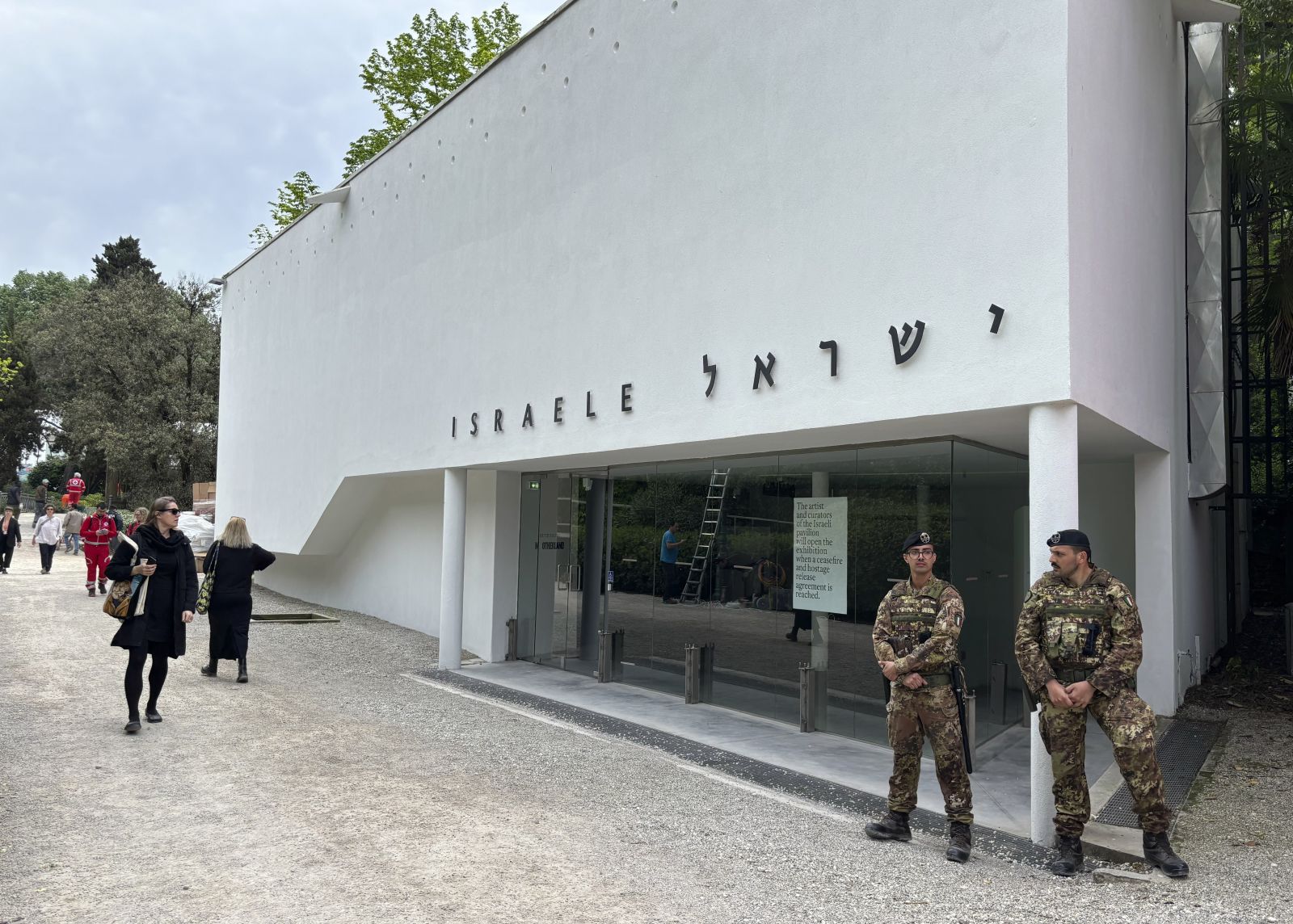 Giardini'deki İsrail pavyonunun önüne ekibin kararını bildiren bir bildirge asıldı. Pavyonu, her saat silahlı üç İtalyan polisi koruyor.