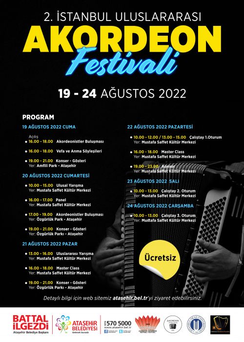Ataşehir Belediyesi, Akordeon ve Körüklü Çalgılar Eğitim ve Uygulama Çalışmaları Derneği (AKORDER), İstanbul Okan Üniversitesi ve Dünya Akordeon Konfederasyonu ortaklığı ile düzenlenecek “2. İstanbul Uluslararası Akordeon Festivali”, 19 – 24 Ağustos tarihleri arasında Mustafa Saffet Kültür Merkezi, Özgürlük Parkı ile Amfili Park’ta düzenlenecek.