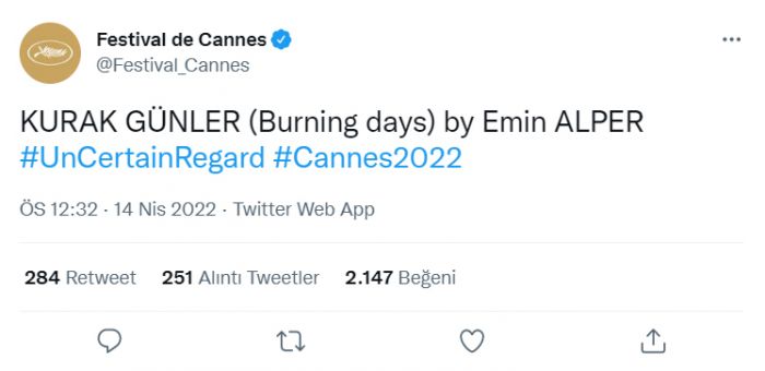 Yönetmen Emin Alper'in dördüncü uzun metraj filmi"Kurak Günler", bu yıl 17-28 Mayıs 2022 tarihleri arasında düzenlenecek 75. Cannes Film Festivali'nin "Belirli Bir Bakış" (Un Certain Regard) bölümüne seçildi. Türkiye-Fransa-Almanya-Hollanda-Yunanistan-Hırvatistan ortak yapımı filmin dünya galası da "Belirli Bir Bakış"ta yapılacak.