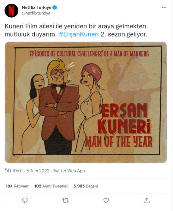 Netflix Türkiye’nin resmi sosyal medya hesabından yapılan paylaşımda “Kuneri Film ailesi ile yeniden bir araya gelmekten mutluluk duyarım. Erşan Kuneri 2. sezon geliyor.” ifadeleri yer aldı. Bununla birlikte paylaşımda Erşan Kuneri’nin yer aldığı bir karta da yer verildi.