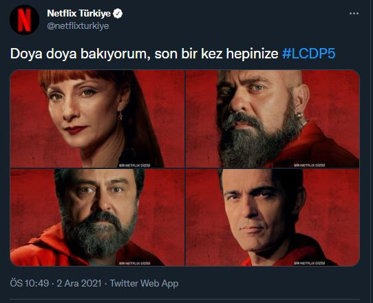 Netflix’in Twitter hesabından ise karakterleri fotoğrafları paylaşıldı. Paylaşılan fotoğraflara da “Doya doya bakıyorum, son bir kez hepinize” mesajı eklenmesi dikkat çekti...