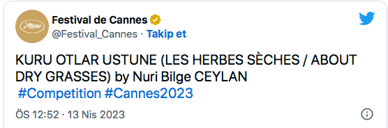 76. Cannes Film Festivali'nin programı açıklandı. Festival'in resmi Twitter hesabından yapılan paylaşımda Nuri Bilge Ceylan'ın Kuru Otlar Üstüne filminin de ana yarışmada yer alacağı belirtildi.