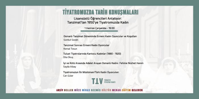 Seçtiği sıradışı konularla, çok yönlü tartışmalara olanak sağlayan vakıf, son olarak “Tiyatromuzda Tarih Konuşmaları” kapsamında “Lisansüstü Öğrencileri Anlatıyor: Tanzimat’tan 1950'ye Tiyatromuzda Kadın” ve “Akademik Bir Disiplin Olarak “Tiyatro Tarihi ve Tarih Yazıcılığı”: Tanımlar, Tartışmalar, Yeni yaklaşımlar” konularını ele alacak. Etkinlikler, 1 Haziran ve 15 Haziran tarihlerinde Çarşamba günü, saat 19.00’da gerçekleşecek. Prof. Dr. Kerem Karaboğa öncülüğünde İstanbul Üniversitesi Edebiyat Fakültesi Tiyatro Eleştirmenliği ve Dramaturji Bölümü yüksek lisans ve doktora öğrencileri tarafından gerçekleştirilecek ilk oturumda, Türkiye tiyatrosunda kadının yeri ve tiyatro sanatına katkısı çeşitli açılardan irdelenecek. İkinci oturum, akademisyen Nilgün Firidinoğlu’nun araştırmalarından yola çıkarak tiyatronun “suya yazılan yazıdan” tarihe kalan yazıya dönüşmesi için gereken bilimsel yöntemleri tartışmaya açacak.