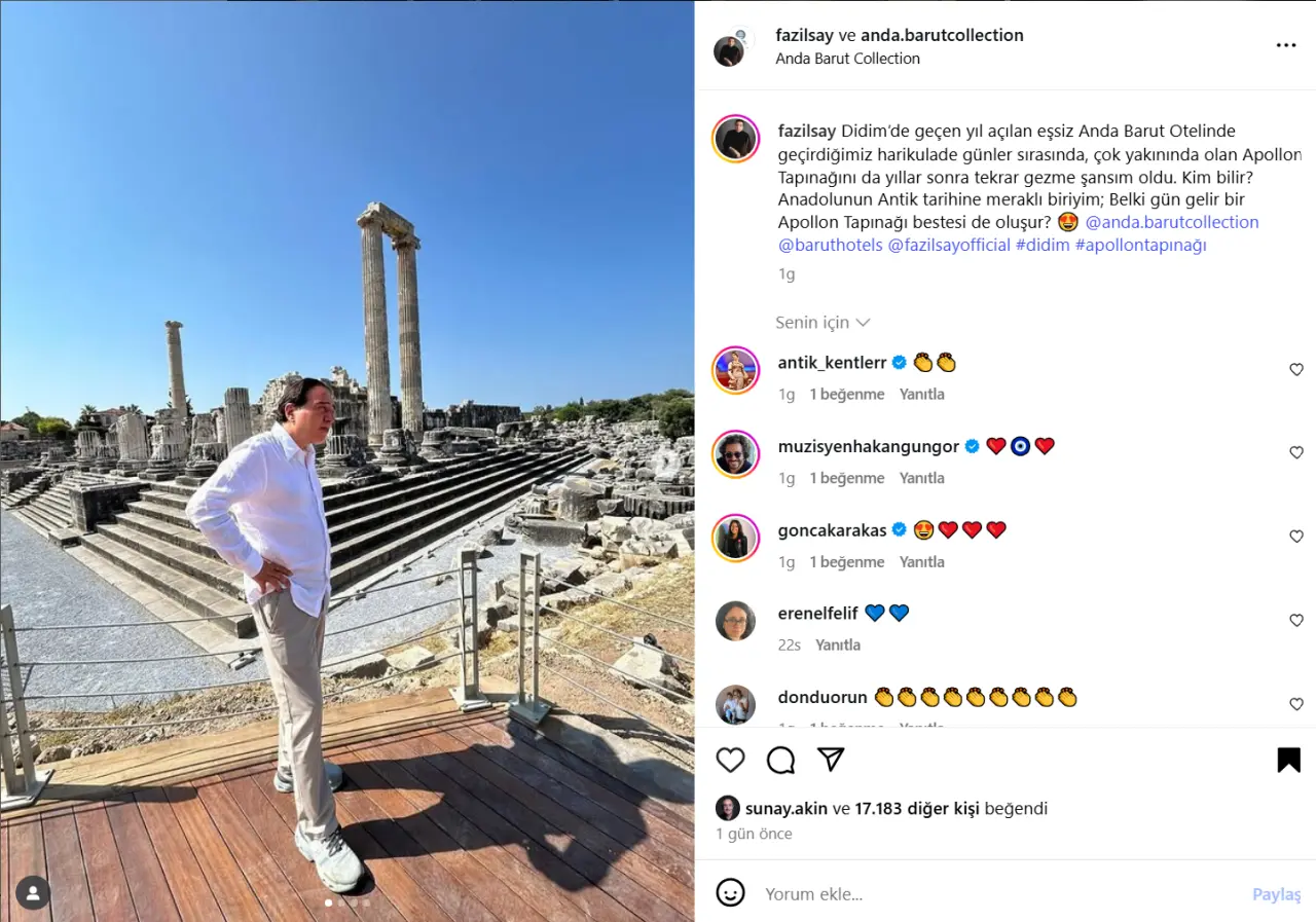 Fazıl Say kendisine ait sosyal medya hesabından yaptığı açıklamada tapınağa olan hayranlığını dile getirdi. Say “Didim’de geçirdiğimiz harikulade günler sırasında, çok yakınında olan Apollon Tapınağını da yıllar sonra tekrar gezme şansım oldu. Kim bilir? Anadolu'nun Antik tarihine meraklı biriyim; Belki gün gelir bir Apollon Tapınağı bestesi de oluşur?” dedi.