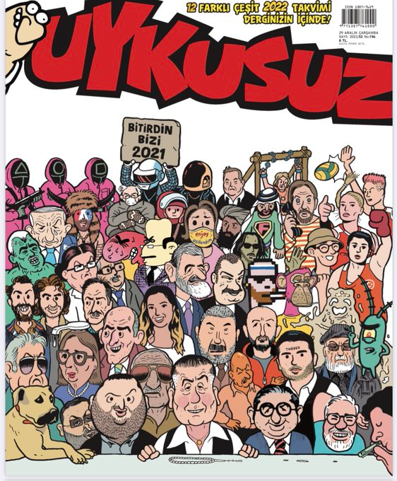 Uykusuz, 2021'e veda ederken sene boyunca Türkiye'de konuşulan olayları resmetti. Dergi, "bitirdin bizi 2021" notunu düştü.