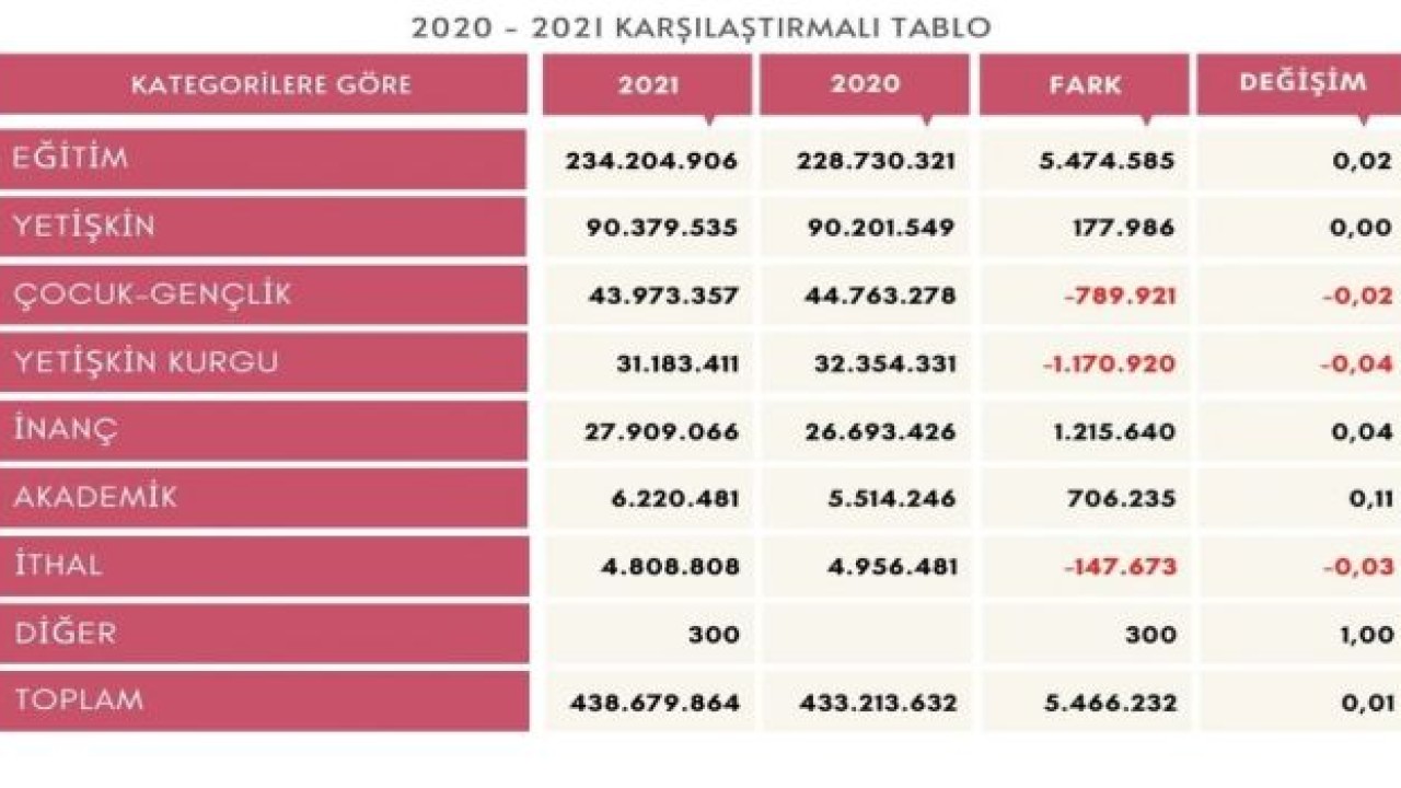 2020’de 433 milyon 213 bin 632 olan toplam bandrol sayısı 2021’de 438 milyon 679 bin 864’e çıktı. İlk kez basılan kitap başlık sayısı ve bandrol rakamlarında gerçekleşen azalma tedirginlik yarattı. 2021’de ilk kez basılan kitap başlık sayısında 1505 adet, bandrol sayısında ise 5 milyon 890 bin 848 adet azalma meydana geldi. İlk kez basılan kitapların baskı sayısı 2020’de 161 milyon 38 bin 506 iken bu rakam 2021’de 155 milyon 147 bin 658’e geriledi.