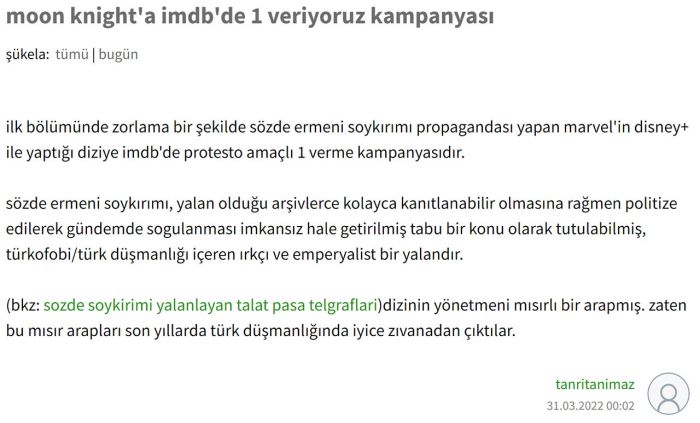 Ekşi Sözlük’te başlayan kampanya kapsamında Türk izleyiciler, sözde Ermeni Soykırımı’nın meşrulaştırılması nedeniyle Moon Knight’a IMDb üzerinden “1” puan verilmesi isteniyor. Pek çok izleyici kampanyaya katılacağını belirtirken, konu hakkında gelen tepkilerden bazıları şu şekildeydi: