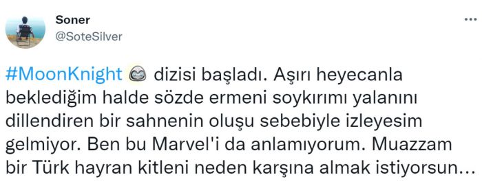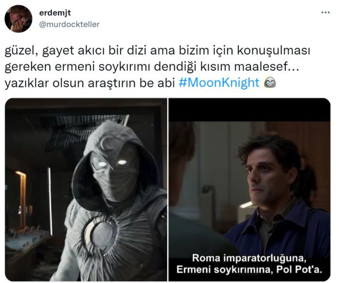 Dizinin baş karakteri Steven Grant, ilk bölümün sonlarına doğru gerçekleştirdiği diyalogda sözde Ermeni Soykırımı’nın adı geçiyor ve olaydan gerçekten yaşanmış gibi bahsediliyor. Pek çok Türk izleyenin tepkisini çeken bu durumun ardındansa izleyiciler, Moon Knight’a yönelik tepkilerini göstermek üzere bir kampanya başlattı.