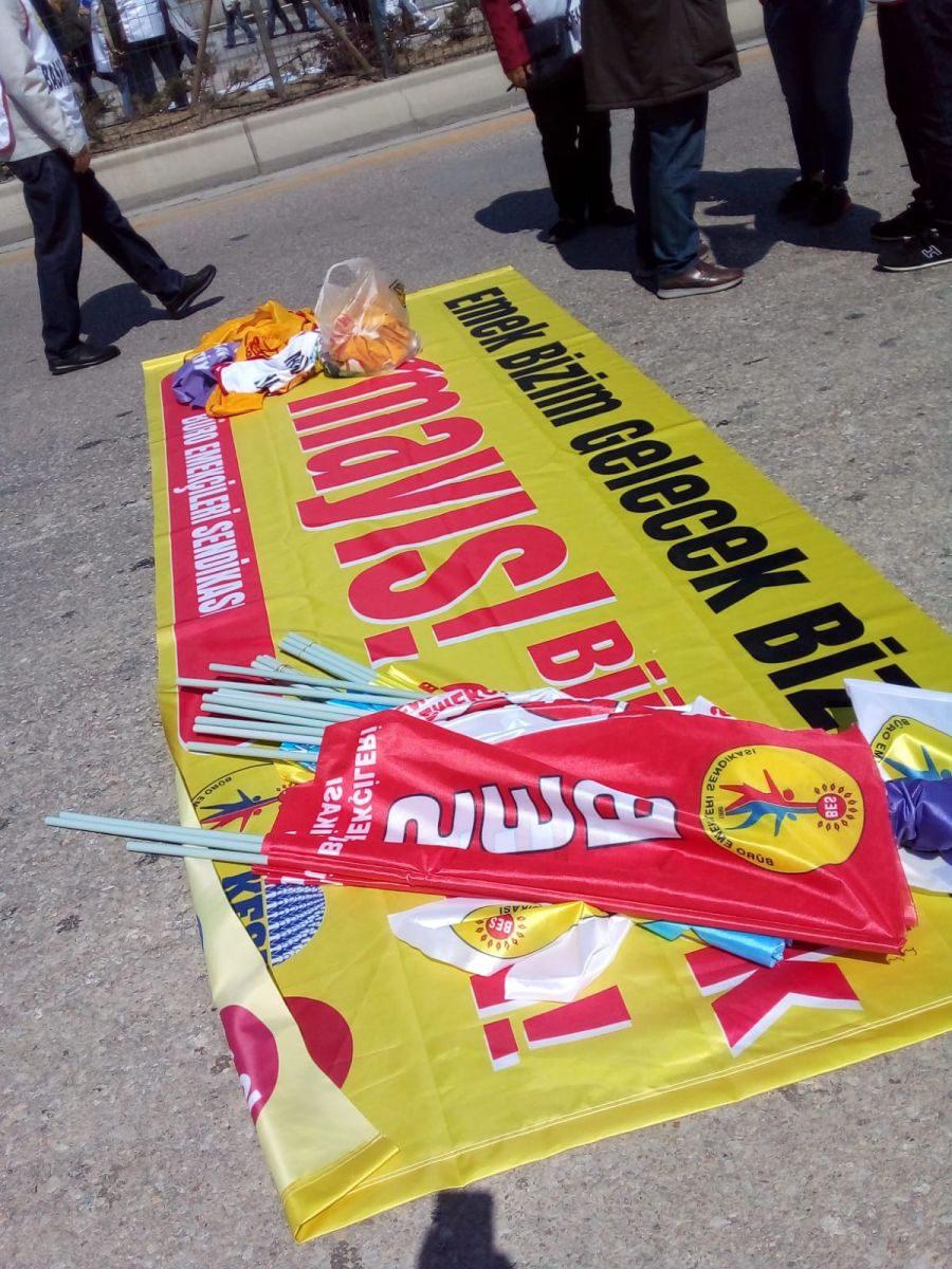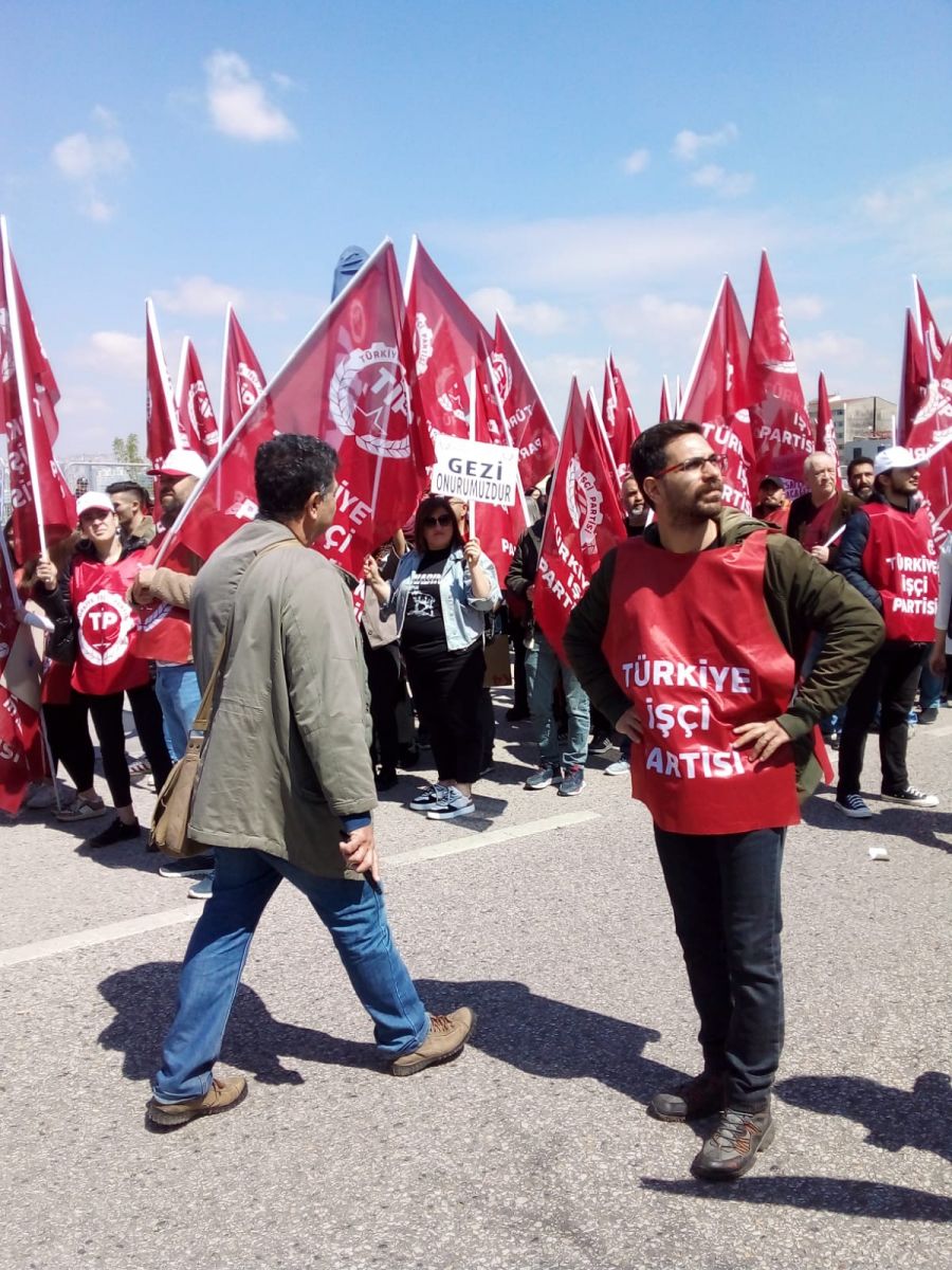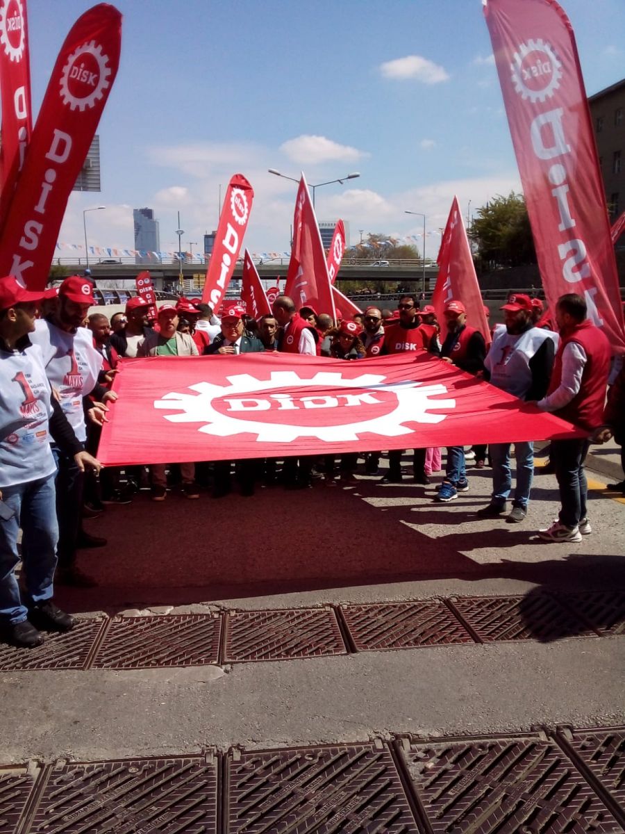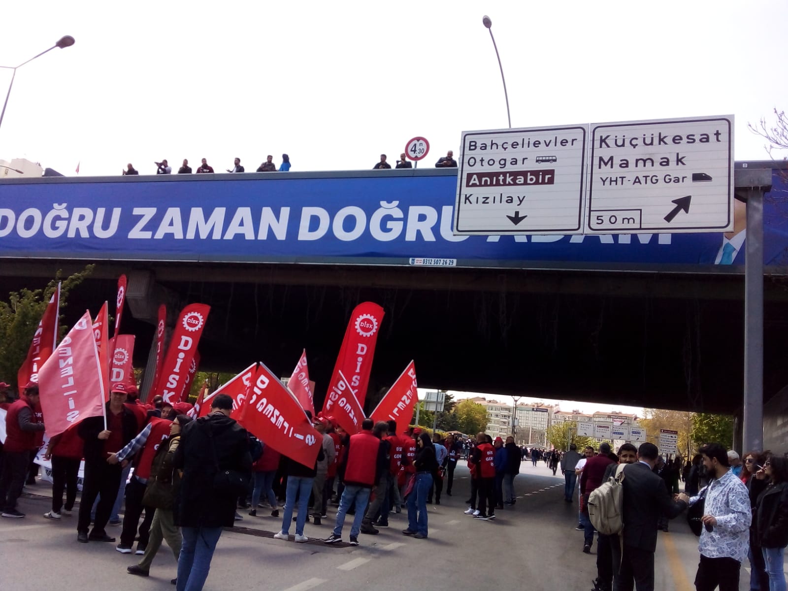 Şarkılar, türküler eşliğinde 1 Mayıs katılımcıları AKP'nin secim sloganı ' Doğru zamada dogru adam' sloganı ve Erdoğan'ın fotoğrafını yer aldığı Tandoğan köprüsünün altından geçti.