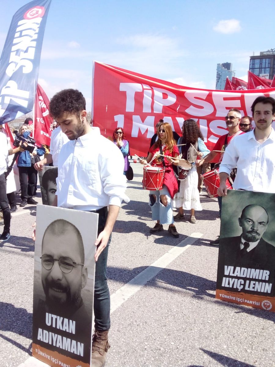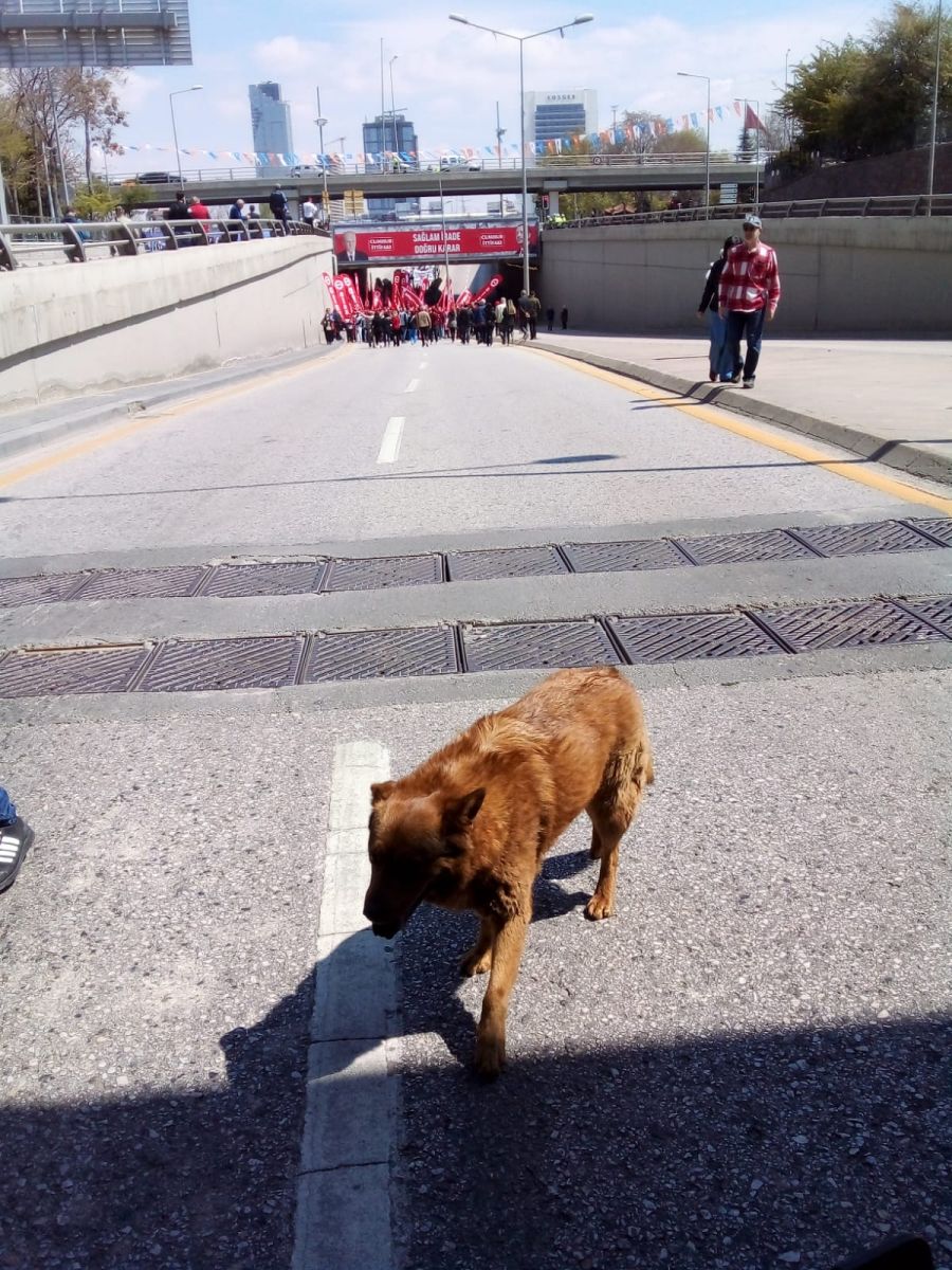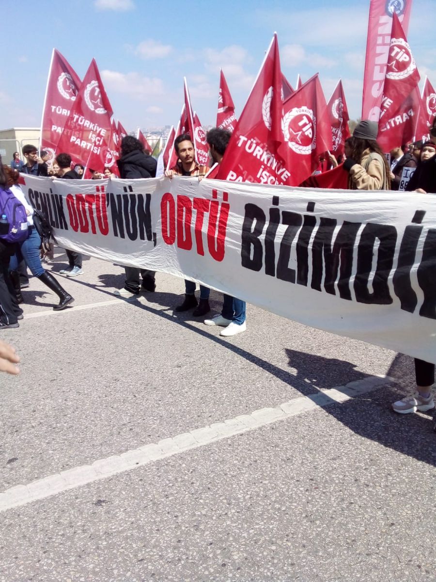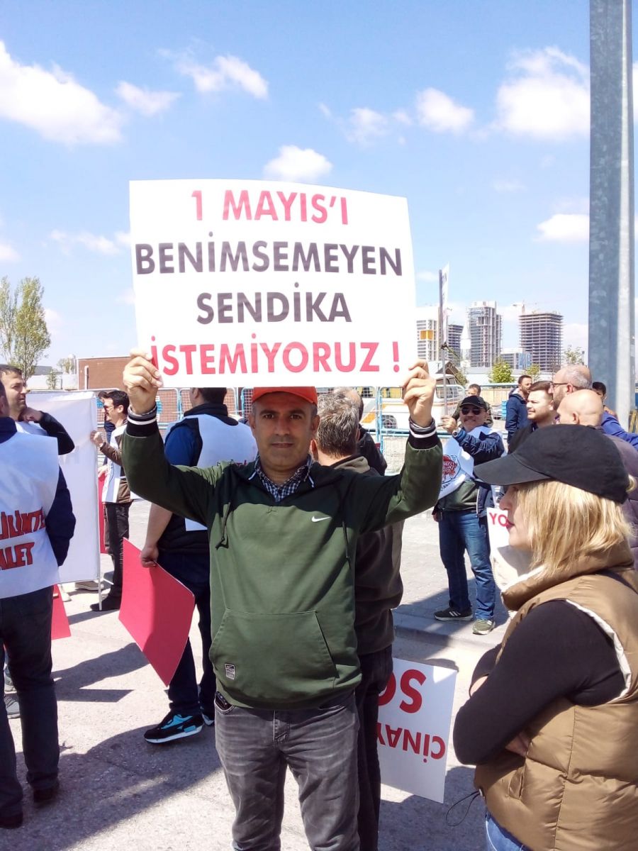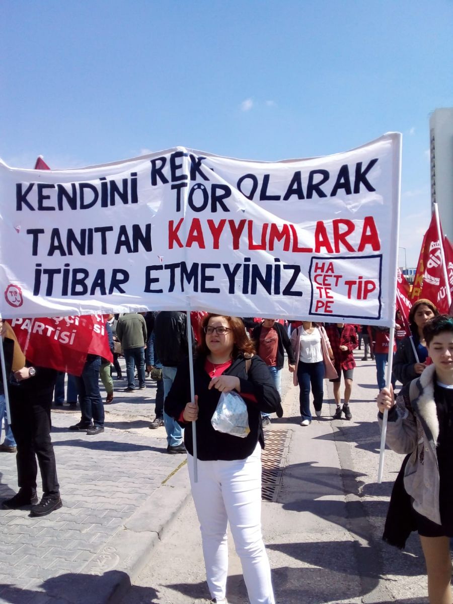 Şarkılar, türküler eşliğinde 1 Mayıs katılımcıları AKP'nin secim sloganı ' Doğru zamada dogru adam' sloganı ve Erdoğan'ın fotoğrafını yer aldığı Tandoğan köprüsünün altından geçti.