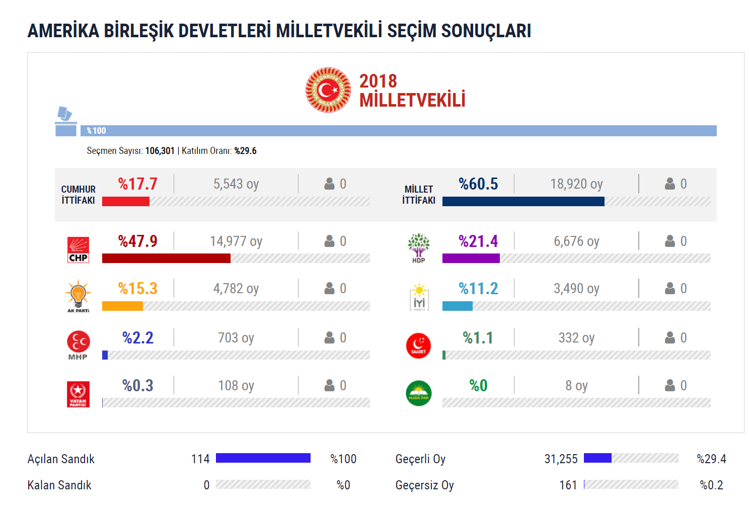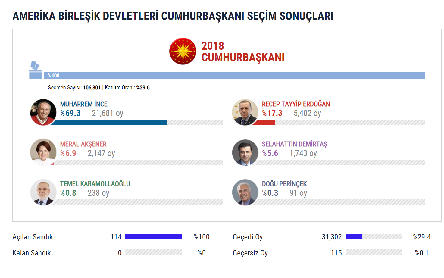 2018 Türkiye Cumhurbaşkanlığı seçimlerinde Amerika Birleşik Devletleri’nde Cumhurbaşkanı Recep Tayyip Erdoğan Yüzde 17.3’lük düşük bir oran yakalarken, Muharrem İnce Yüzde 69.3 ile ilk sırada yer almıştı.