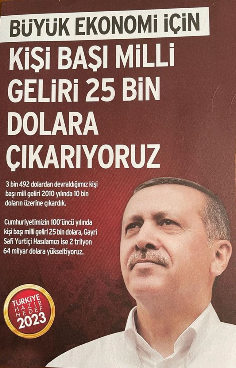 AK Parti 2023 yılı için kişi başına düşen milli gelirin 25 bin dolara çıkacağını vaat etmişti. Kişi başına düşen milli gelir 2011 yılında 10 bin 444 dolardı. Türkiye son olarak ölçümlenen 2022 yılında yerinde saymış kişi başı gelir 10 bin 655 dolar olmuştu. Bu rakamlarla Türkiye, Bulgaristan ve İran gibi ülkelerin bile gerisinde kalmış dünyada 78’nci sırada kendine yer bulmuştur.