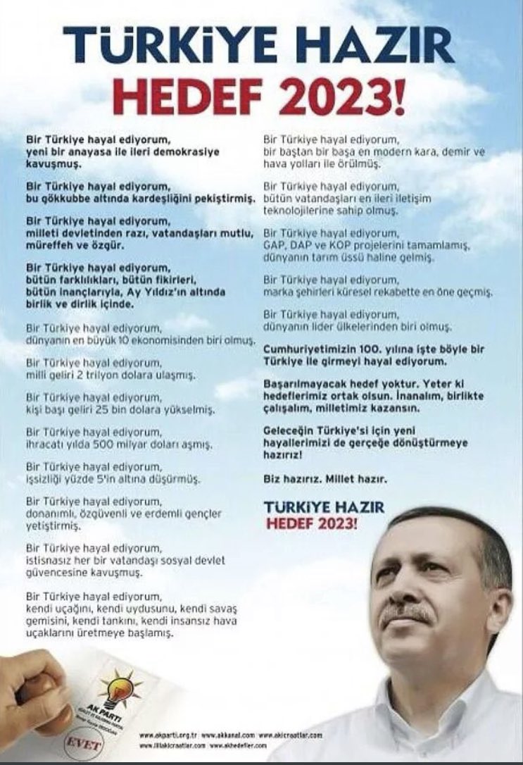 AK Parti 20 yıllık iktidarının en iddialı söylemlerini 2011 genel seçimi öncesinde kullanmıştı. O kadar iddialıydı ki cumhuriyetin 100. Yılı seçilmişti vizyon olarak.