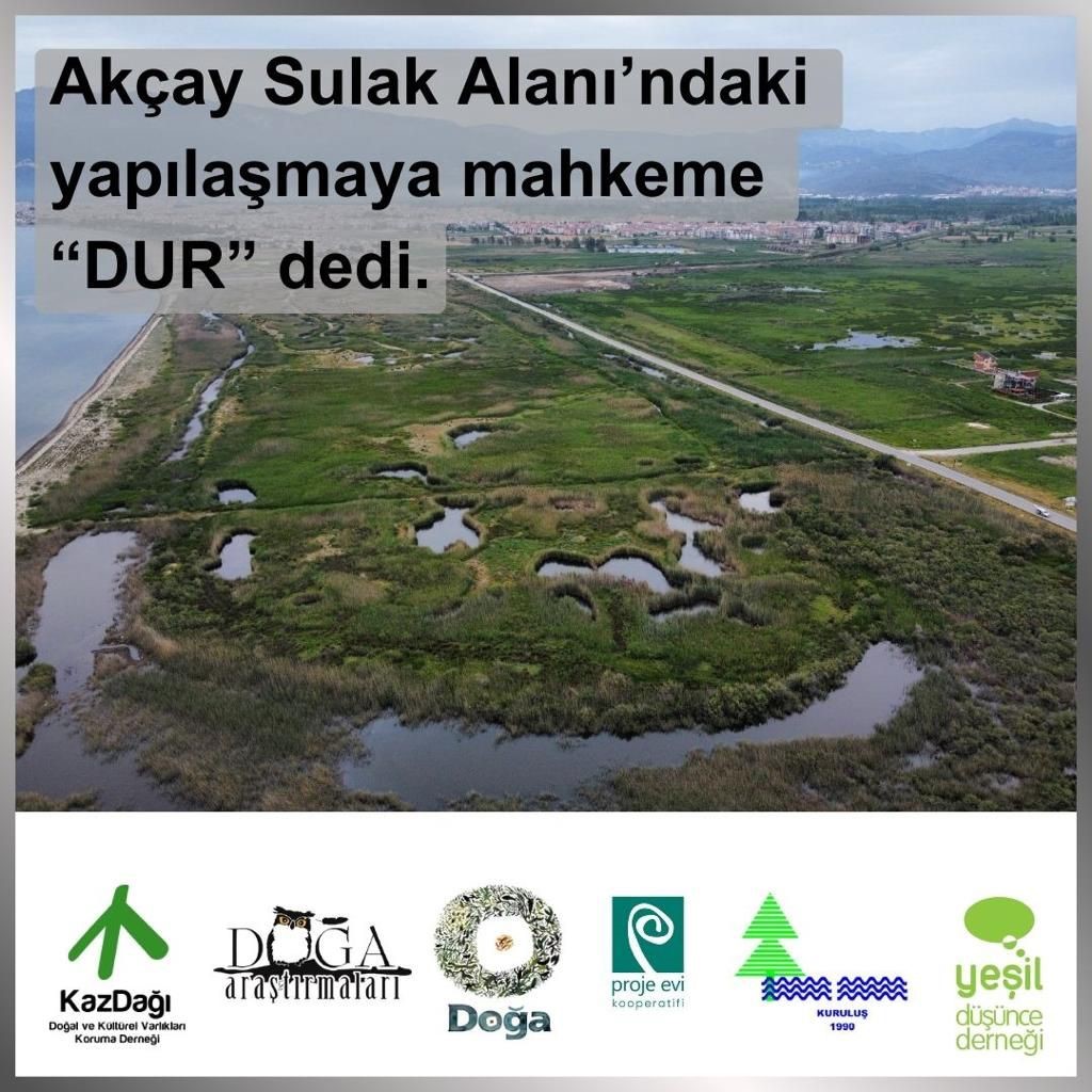 Balıkesir 2. İdare Mahkemesi, Akçay Sazlığı ve Sulak Alanı’ndaki hukuksuz yapılaşmaya dur dedi. “Enginkent Akçay” projesi için Edremit Belediyesi tarafından verilen inşaat ruhsatları ve mülga Zeytinli Belediyesi tarafından yapılan 1980 tarihli onaysız imar planları iptal edildi. Mücadelenin devam edeceğini bildiren Kazdağı Doğal ve Kültürel Varlıkları Koruma Derneği, kararla ilgili, “Akçay Sazlığı ve Sulak Alanı kurdun, kuşun, börtü böceğin, yılan balıklarının yuvasıdır”.