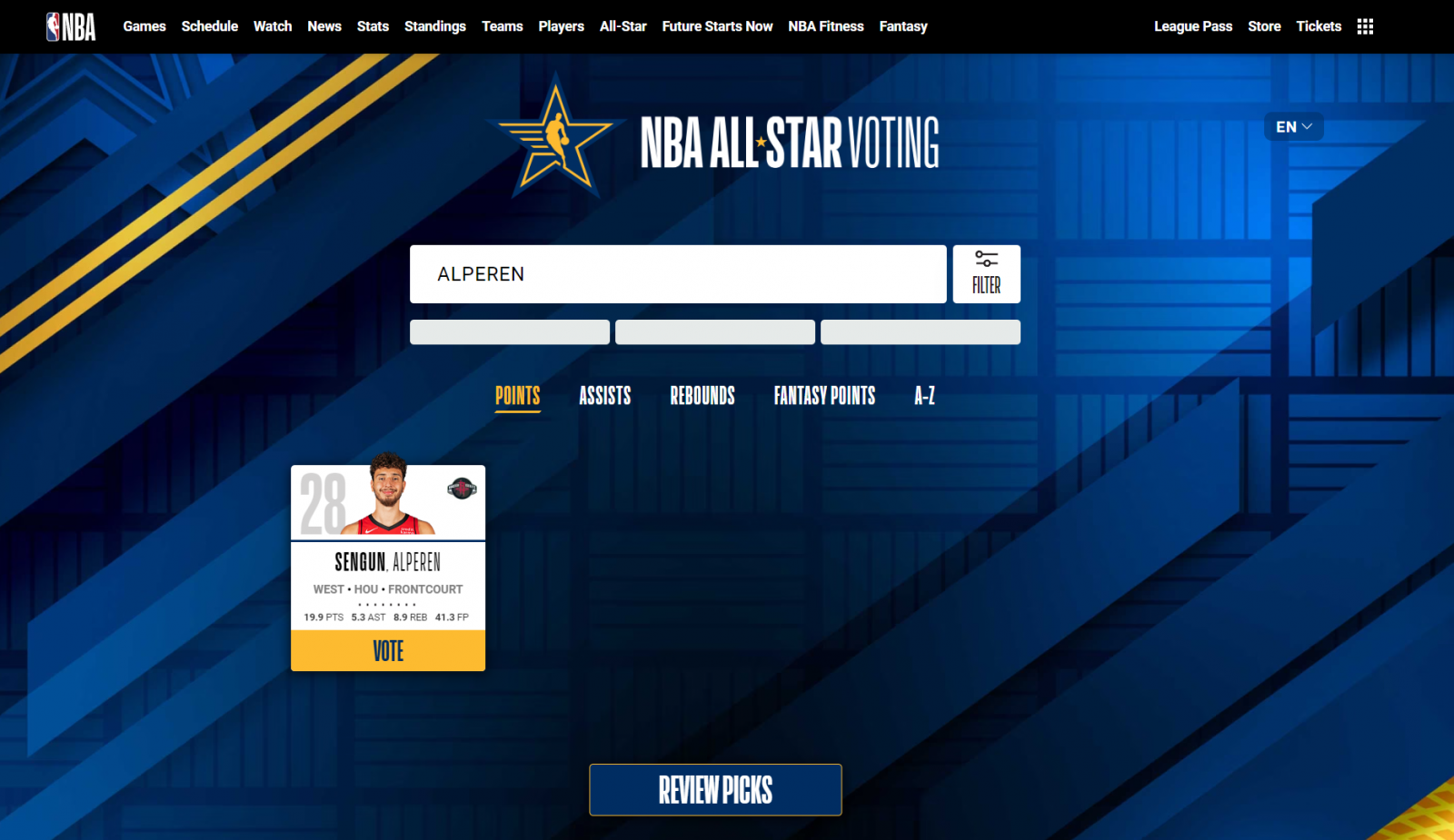 6.    Bizim için Alperen Şengün’e oy vermek önemli olduğu için alt bölümden ‘Review & Submit’ diyerek oy verme işlemimizi tamamlayabiliriz.