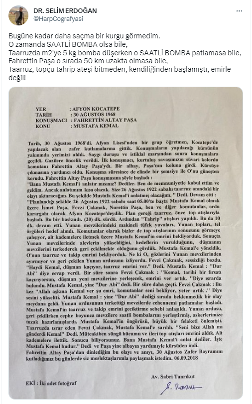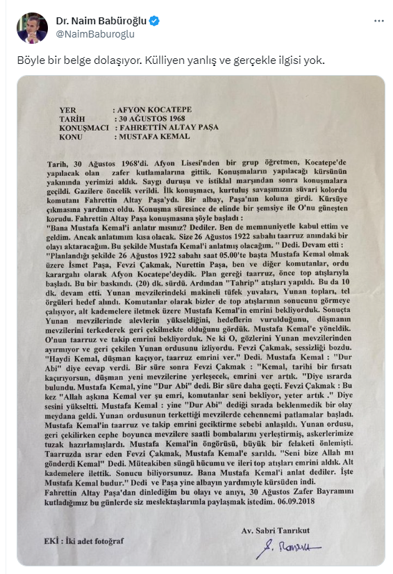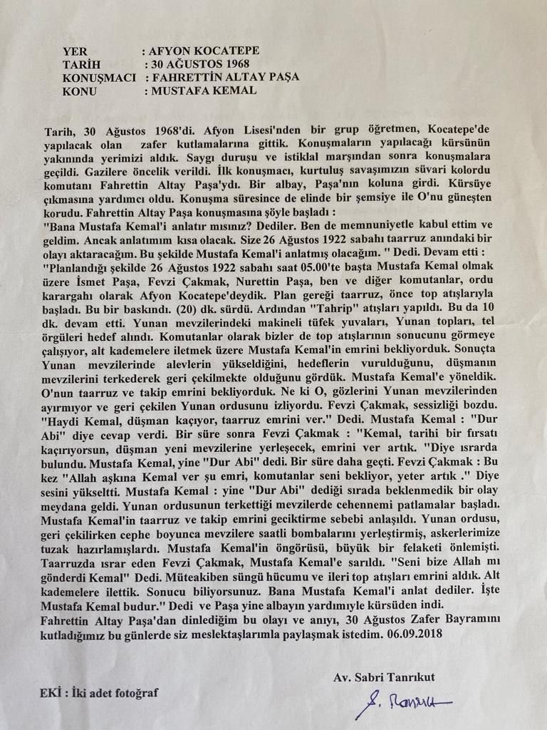 06 Eylül 2018 tarihinde yayınlanan yazı, “Fahrettin Altay Paşa’dan dinlediğim bu olayı ve anıyı, 30 Ağustos Zafer Bayramı’nı kutladığımız bu günlerde siz meslektaşlarımla paylaşmak istedim.” notuyla aktarılmış.
