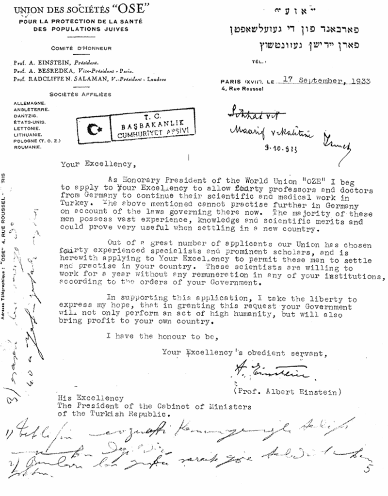 “Albert Einstein'ın Mustafa Kemal Atatürk'e gönderdiği ve Almanya güvenli olmadığı için Yahudi bilim insanlarının Türkiye'de çalışmasına izin vermesini istediği mektup (17 Eylül 1933). Atatürk bilim insanlarını korudu ve onlar da Türk üniversitelerinin büyümesine yardımcı oldular.”