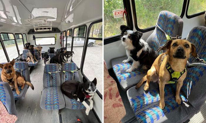 Otobüse binen köpek doğasına uygun olarak diğer köpek dostlarını kokluyor ve ardından kendi koltuğuna oturuyor. Tabi bunlar Thompson’lar tarafından verilen eğitimin bir parçası. Sonrasında emniyet kemerleri de takılıyor bu tatlı canlıların. Ve aynı işlem yaklaşık 12 köpek için de tekrarlanır.