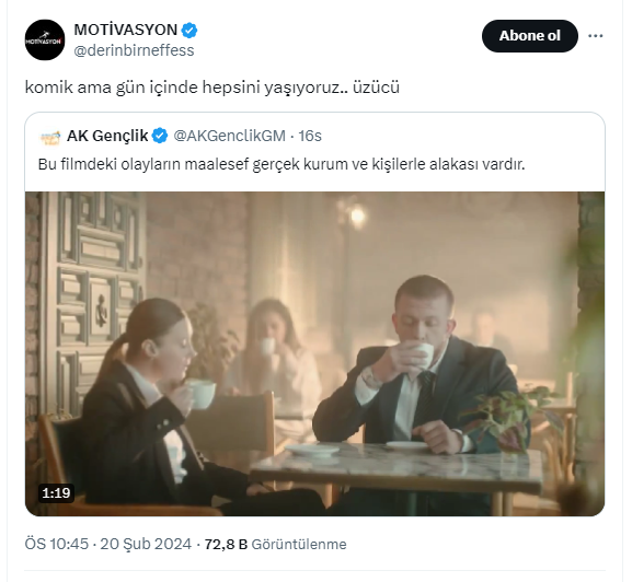 Konusundan filmde aktarılanlara kadar tüm detaylarıyla başarılı diyemeyeceğimiz bu reklam filmini; Twitter’da siyasetle alakası olmayan yüksek takipçili birçok sosyal medya hesabı paylaştı. Sebebine geldiğimizde ise bir ücret karşılığında viral reklam yapıldığını söylemek yanlış olmaz.