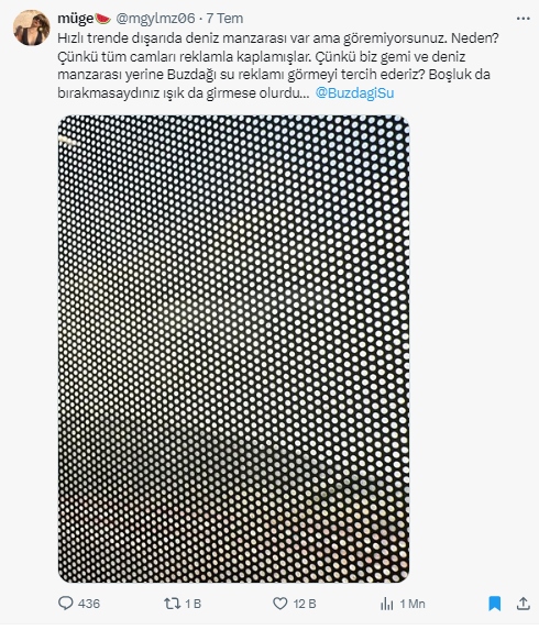 “Hızlı trende dışarıda deniz manzarası var ama göremiyorsunuz. Neden? Çünkü tüm camları reklamla kaplamışlar. Çünkü biz gemi ve deniz manzarası yerine Buzdağı su reklamı görmeyi tercih ederiz? Boşluk da bırakmasaydınız ışık da girmese olurdu… @BuzdagiSu”