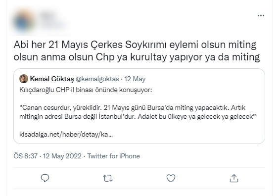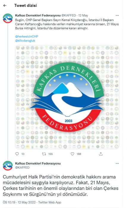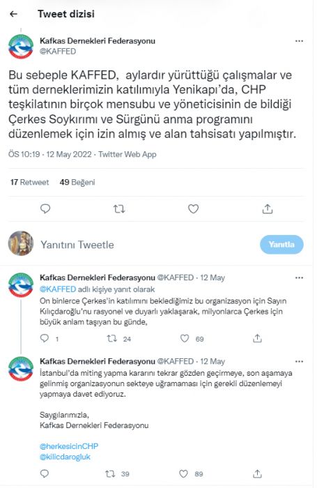 Yaşanan bu durum üzerine Kafkas Dernekleri Federasyonu CHP’ye Twitter üzerinden bir çağrıda bulundu. Federasyon 12 Mayıs tarihli yaptığı paylaşımda şu ifadelere yer verdi;