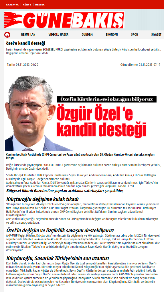 Haber ‘Erzurum güne bakış’ isimli bir haber sitesinde yayınlanmış. İddiaya göre, “Irağın kuzeyinde yayın yapan BÖLGESEL KURDİ gazetesine açıklamada bulunan sözde birleşik Kürdistan halk cehpesi yetkilisi, Değişimin umudu Özgür özel” demiş.