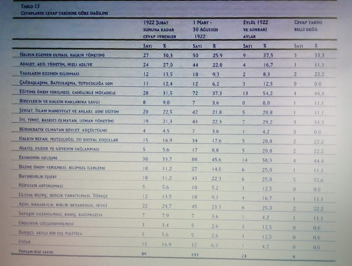 Ankette, “Kazanılacak olan milli istiklal mücadelemizin feyizdar (bereketli) ve semeredar (verimli) olması neye bağlıdır?'' sorusunun yöneltildiği ankete verilen yanıtlarda ilk sıraları, “Halkın Egemen Olması, Halkın Yönetimi, Adalet, Adil Yönetim, Hızlı Adliye, Yasaların Egemen Kılınması, Çağdaşlaşma, Batılılaşma, Tutuculuğa son, Eğitime önem verilmesi, cahillikle mücadele, Bireylerin ve haklarına saygı” paylaşıyor.