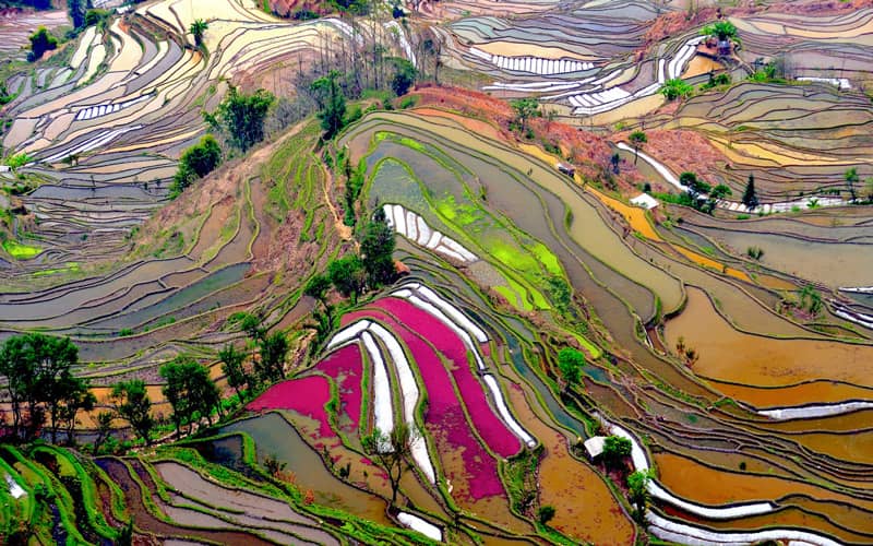 Çin’in Yunnan şehrinde, Ailao Dağı eteklerinde bulunan pirinç tarlaları, teraslı yapıları ve farklı renkteki görüntüleriyle oldukça ilginç bir yapıda. Özellikle kuş bakışı açıdan insanı etkilemeyi başaran bölgenin 2 bin 500 yıllık bir geçmişi var. UNESCO Listesi’ndeki tepeyi görmek isteyen binlerce kişi her yıl bu şehre geliyor.