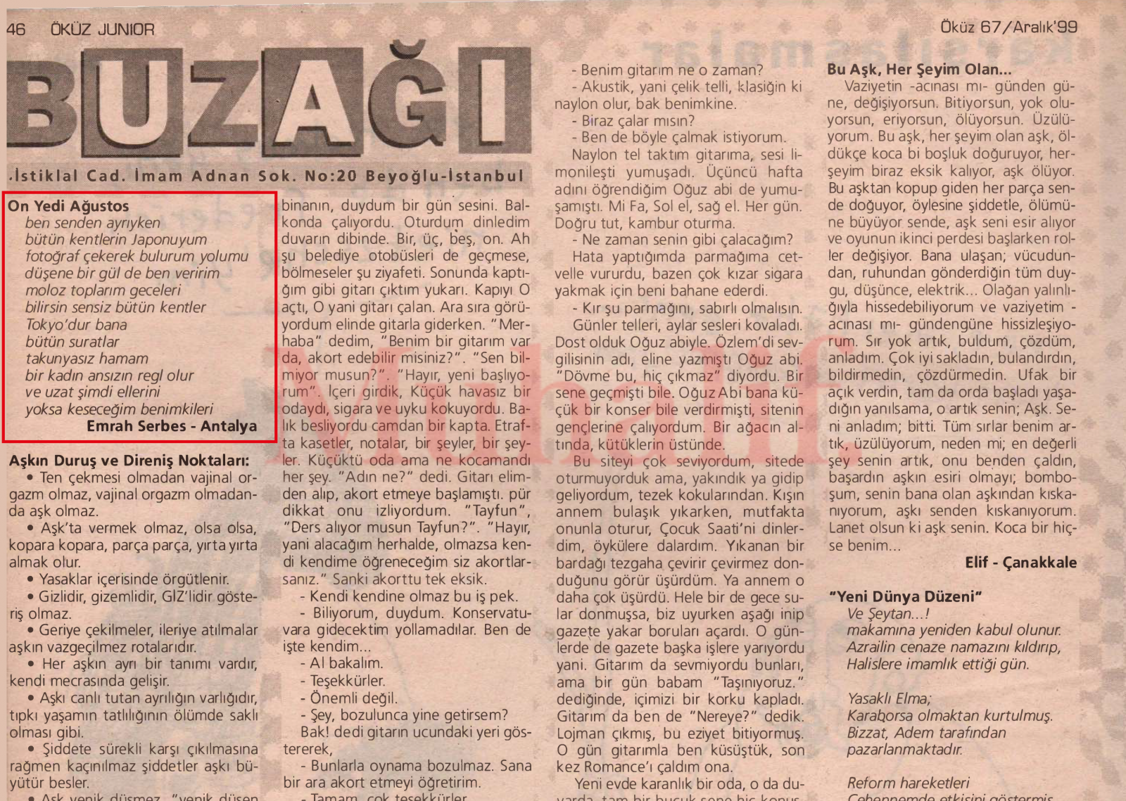 Ünlü yazarın diskografisinde yer aldığına göre ilk eseri 2006 yılına ait. Dergiye gönderilmiş çalışması ise 1999 yılının Aralık ayına ait. Ve esas farklı kısım ise Serbes’in dergide yayınlanan içeriği bir düz yazı değil, bir şiir.