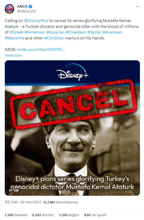 Ermeni lobisi kurumlarından ANCA; Ulu Önder Mustafa Kemal Atatürk’ü Türk diktatör ve elinde milyonlarca kişinin kanı olan bir soykırım katili olarak tanımlarken Disney Plus’a diziyi iptal etme çağrısında bulunuyordu.