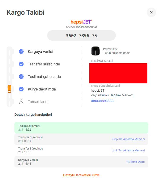 Bir sorun çıkmadan teslim edileceğini düşünüyordum ki, site arayüzüne girdim. Kurye dağıtımda ve kargo hareketlerinde teslim edilemedi yazıyor. Benim durumdan hiçbir haberim yok ve neden teslim edilemediğine dair bir neden de yazmıyor.