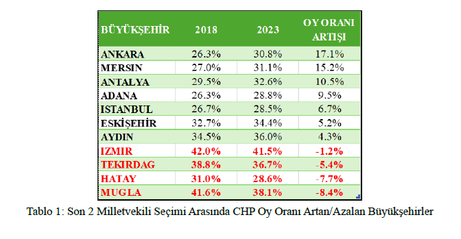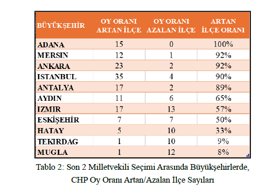 • Büyükşehir Belediye Başkanlarının başarılı olup olmadıklarının bir başka kriteri de “Hizmet Götürdükleri İlçelerden Kaçında CHP Oy Oranının Arttığıdır”.