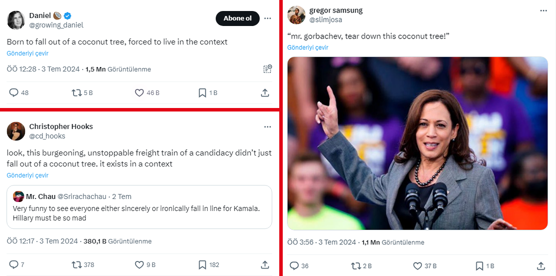Harris destekçileri sosyal medyada ‘hindistan cevizi ağacından düşmek’ konseptli paylaşımlarda bulunuyorlar. Bu paylaşımlar Joe Biden’ın Donald Trump’la gerçekleştirdiği başkanlık tartışmasındaki felaket performansından sonra yapılmaya başlandı. Destekçilerin bu akıma verdiği isim ise ‘Hindistan Cevizi Ağacı Harekatı’.