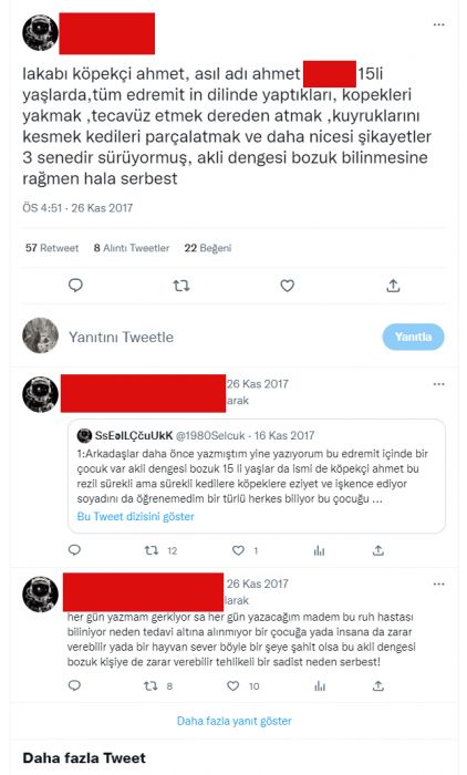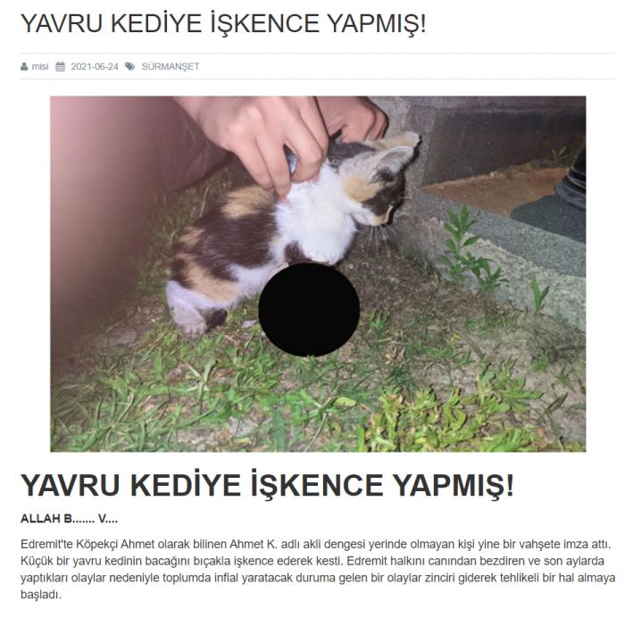 Balıkesir Edremit’te yaşayan ‘Köpekçi Ahmet’ lakaplı zihinsel engelli bir şahıs yıllardır kedi ve köpeklere işkencede bulunuyor; tecavüz ediyor, çeşitli şekillerde katlederek öldürüyor. Hakkında kanıtlara dayalı olarak şikayetler bulunmasına karşın aynı durum devam ediyor. Şahsın ebeveynleri devletten engelli maaşı almak için çocuğunu tedavi ettirmiyor.