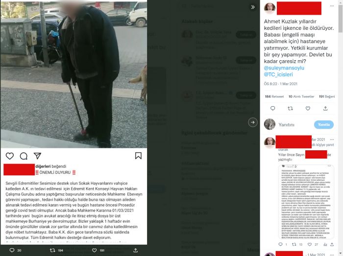Akli dengesi yerinde olmayan 19 yaşındaki Ahmet K.’nın ailesi hakkında ebeveyn görevlerini getirmiyor denilerek dava açılmış ve baba K.K.’dan vasiliği alınmış, Balıkesir’de bakım merkezine yatırılmış. 3 aylık bu sürecin sonrasında annesi B.K. vasilik için mahkemeye başvurmuş ve hak kazanmış. Sonuç olarak değişen bir durum olmamış zihinsel engelli şahıs sokakta hayvan katliamına devam ediyor.
