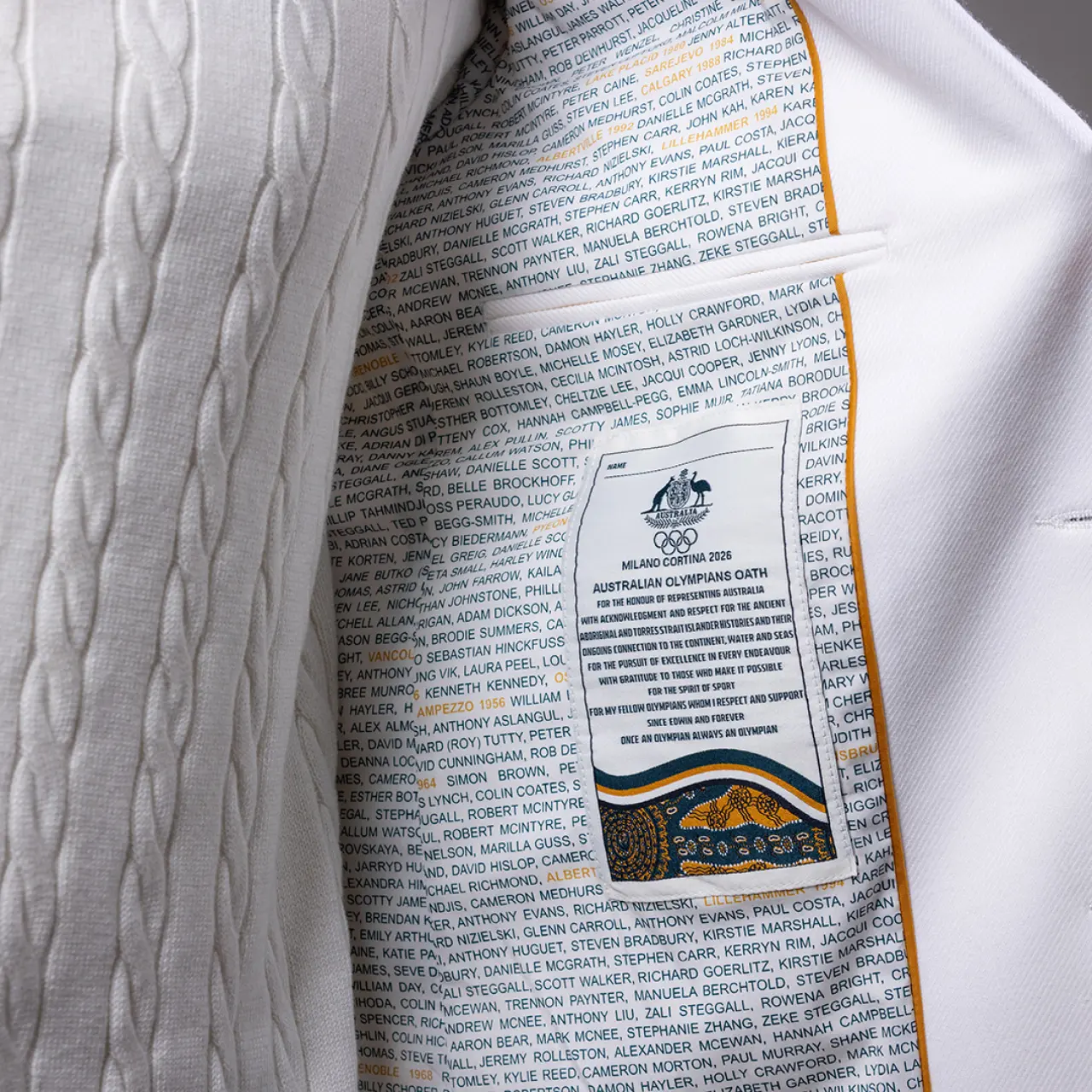 Altın düğme detayları ve yeşil-altın renk paletiyle 1990'ların nostaljik görünümlerine gönderme yapan kitlerin içinde gizli bir vatansever dokunuş da var: Geçmişte altın madalya kazananların -tahmin edebileceğiniz gibi- altın rengiyle vurgulandığı, her Avustralyalı Kış Olimpiyatçısının isminin yer aldığı bir bölüm. David Bosun ve Paul Fleming'in yerli sanat eserleri de Avustralya'nın atletik topluluğunun genişliğini kutluyor.