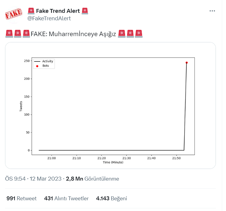 Twitter’da gerçekleşen sahte trendleri rapor eden ‘Fake Trend Alert’ isimli bir sayfa ‘Muharremİnceye Aşığız’ başlığıyla sahte tweetler atıldı uyarısında bulundu.