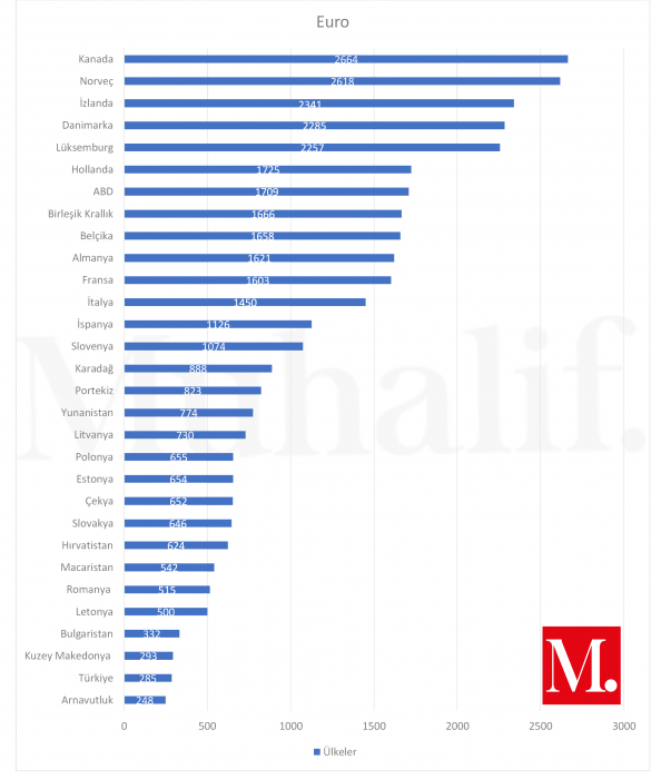 Tabloda yer alan tüm ülkelerin asgari ücret rakamları euroya çevirilerek sıralanmıştır.