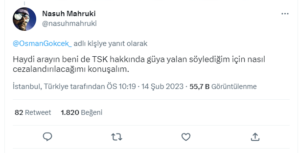 Akut kurucusu Nasuh Mahruki depremin gerçekleştiği 6 Şubat 2023 tarihi öğle saatlerinde Fox Haber’in konuğu olmuştu. Mahruki programda, askeri kast ederek şu ifadeleri kullanmıştı: