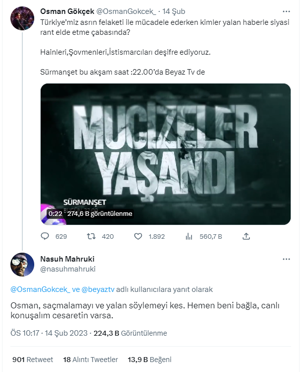 Osman Gökçek dünkü programda Nasuh Mahruki’ye tam aksi yönündeki fikrini belirterek askerin ilk anda itibaren deprem bölgesinde olduğunu belirtti. Gökçek bu fikrini belirtirken de sahada “26.987 tane TSK personeli”nin bulunduğunu söyledi. Ancak Savunma Bakanlığı’nın yayınladığı açıklamada bu rakam 3 binden fazla olarak açıklanmıştı. Yani Gökçek, Mahruki'nin 6 Şubat günü için belirttiği durumu, 14 Şubat olarak yanıtlamış oldu.