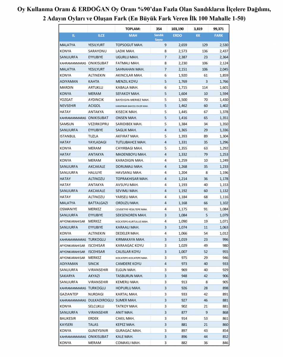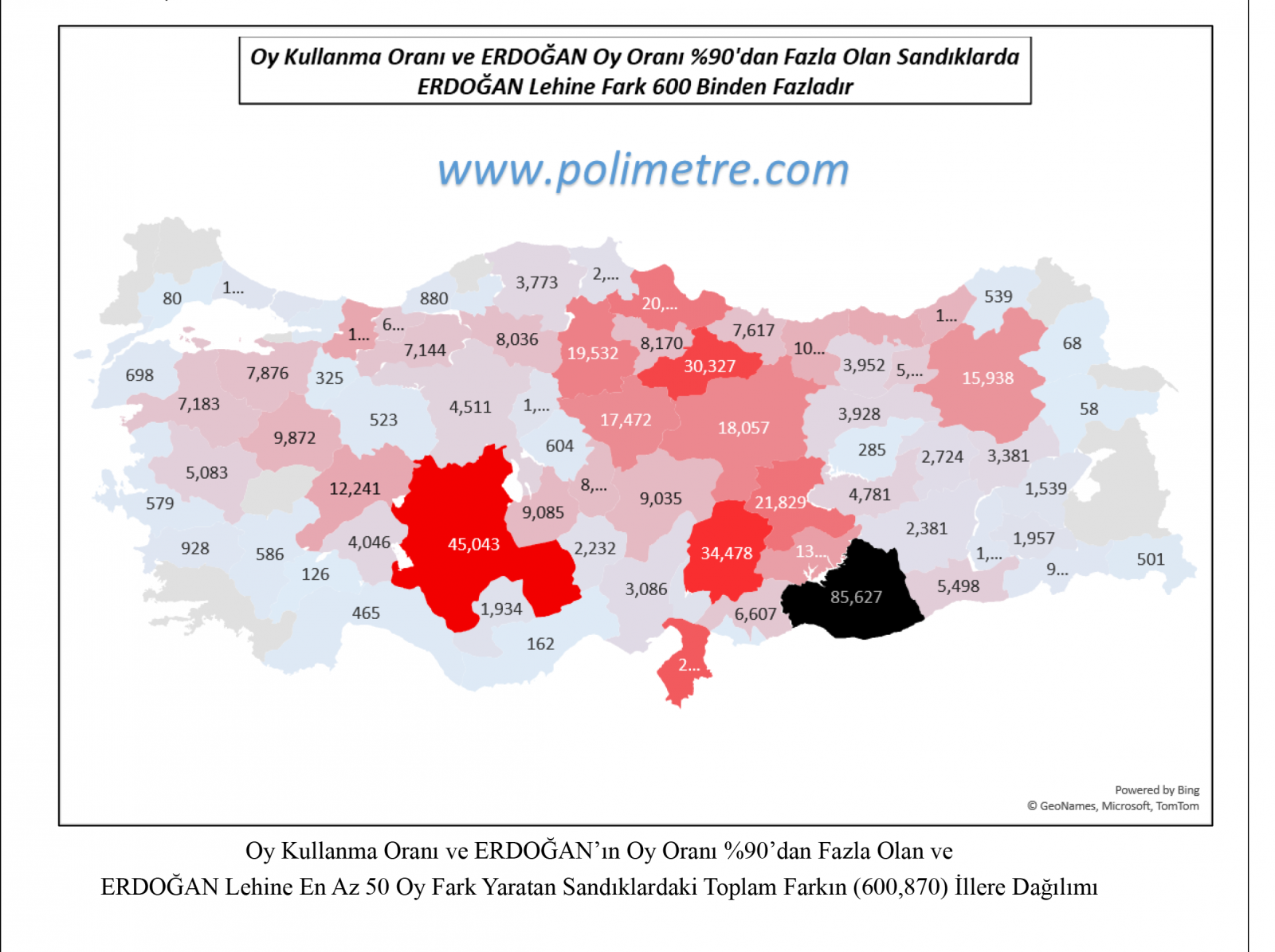 Oy kullanma oranı yüzde 90 olan 3,771 sandık da Erdoğan’ın aldığı oy oranının 627bin 223, Kılıçdaroğlu’nun ise 26bin 353 oy aldığını ve arada 600 binden fazla fark oluştuğuna dikkat çeken Polimetre, “Sandıkların mahallelere dağılımına bakıldığında, sadece 100 mahallede 100 bine yakın (99,371) fark oluştuğu görülmektedir. Bu mahallelerdeki toplam sandık sayısı 354’tür” açıklamasını yaptı. Polimetre, “Bu sandıklarda Sandık Güvenliği Önlemlerinin arttırılmasıyla bu farkın aşağılara çekilebileceği düşünülmektedir” dedi.