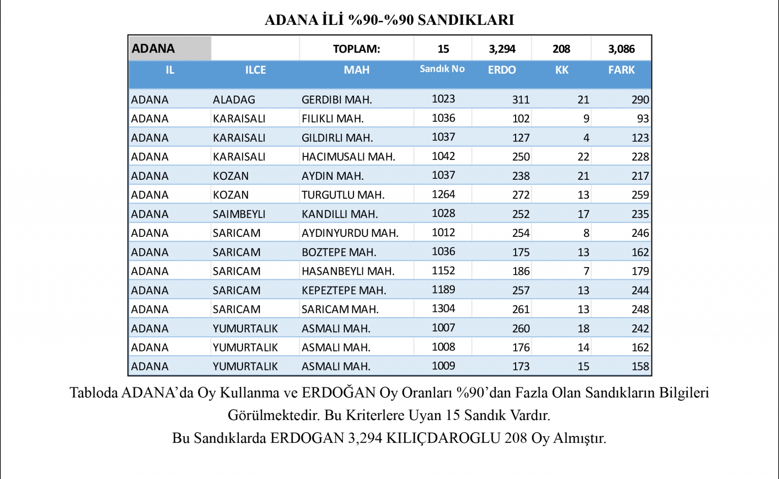 Çalışmaya göre, sandıkların mahallelere dağılımına bakıldığında, sadece 100 mahallede 100 bine yakın (99,371) fark oluştuğu görülüyor. Adana da 3254 sandıkta Erdoğan, lehine en az 600 bin 870 fark oluştuğu görülüyor.