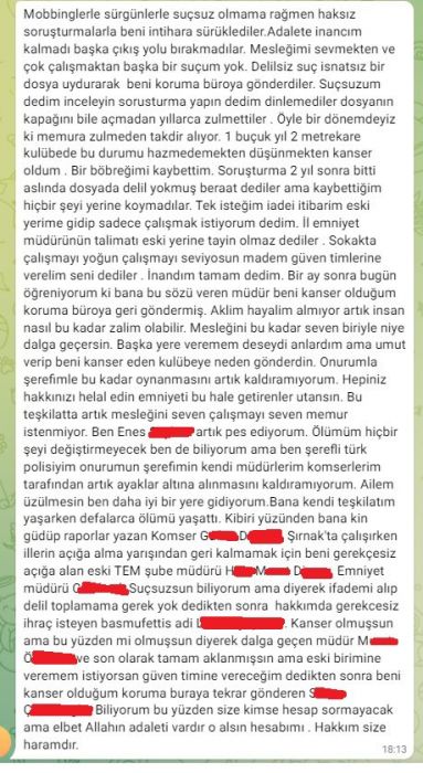 İntihar eden polis memuru Enes S. intihar mektubunda, ‘’Mobinglerle sürgünlerle suçsuz olmama rağmen haksız soruşturmalarla beni intihara sürüklediler, başka yol bırakmadılar’’ demişti.