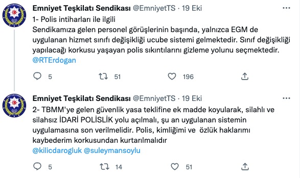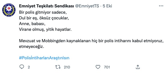 Emniyet mensuplarını temsil etiiğini belirten ‘’Emniyet Teşkilatı Sendikası’’ isimli sosyal medya hesabı, polis intiharlarının araştırılması için sosyal medyada seslerini duyurmaya devam ediyor.