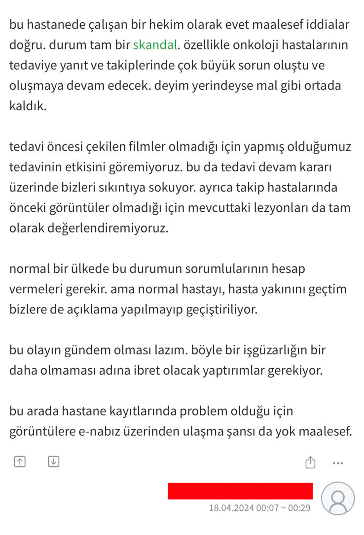 Asıl paylaşımı yapan kişininin yanı sıra, hastanede çalışan bir doktor olduğunu belirten bir kişi daha iddiaların maalesef doğru olduğunu söyledi. Paylaşımın dün gece yanındayken bugün silindiği gözüküyor.