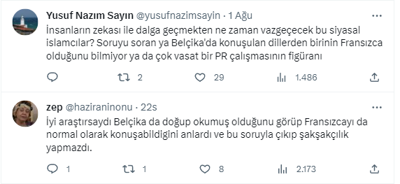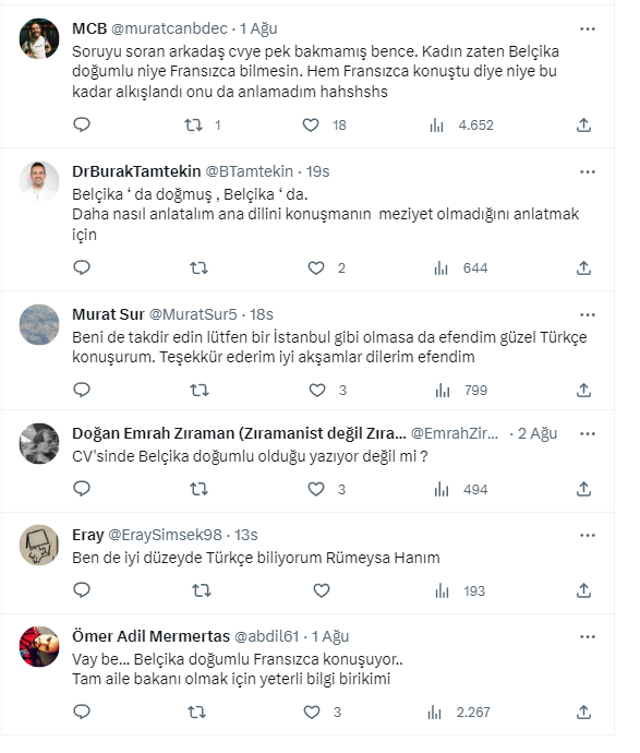 Ancak o anlar videoya alınarak bir milletvekili tarafından paylaşılıyor ki. Paylaşımda “Fransızca sadece CV’de durmuyormuş.” gibi bir ifade kullanılıyor. Rümeysa Kadak gibi deneyimli bir milletvekilinin bakanı anadilini konuştuğu için tebrik etmesi çok abes bir durum.