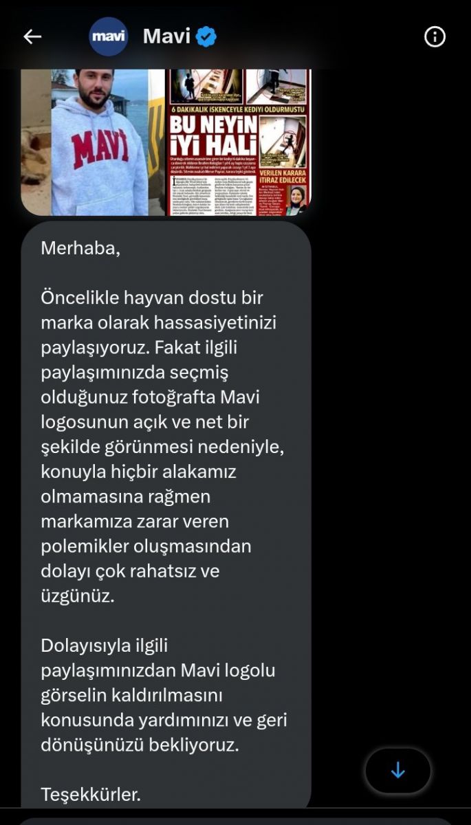 Mavi’nin resmi hesaplardan aldığı ilk ve tek aksiyon, haberlerde ve paylaşımlarda kullanılan fotoğraf seçimine yönelik oluyor. Bir kullanıcıya, şahsın Mavi ürünü giydiği fotoğrafı kaldırması için resmi hesaptan mesaj gönderiliyor.