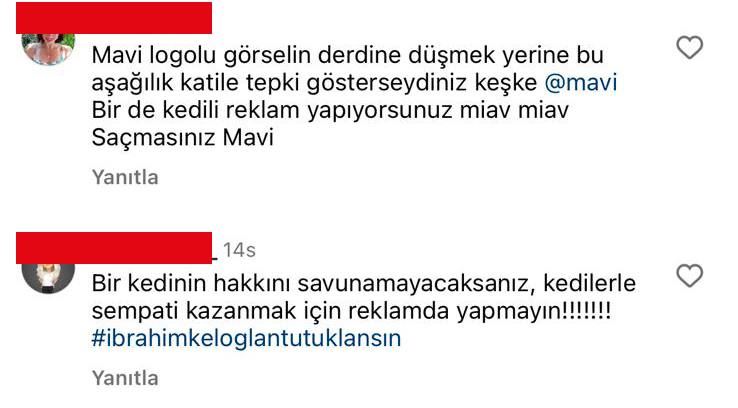 Mavi’nin, bir hayvan katilinin üzerinde kendi ürününü görmesinden rahatsız olması güzel bir durum. Ancak; hayvan dostu imajına sahip böyle önemli bir markadan asıl beklenen, olayı kınayan resmi bir açıklamaydı diye düşünüyoruz.