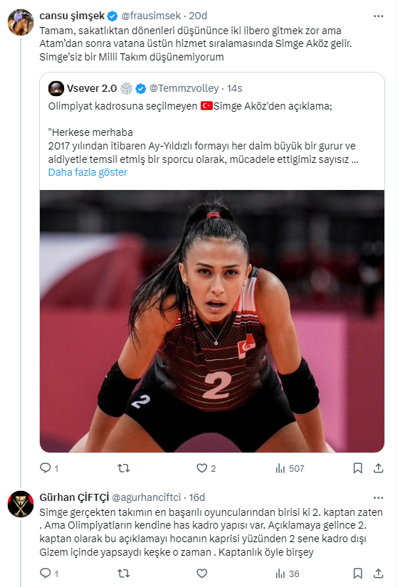 Türkiye A Milli Kadın Voleybol Takımı’nın Paris 2024 Olimpiyatları’na katılacak kadrosu açıklandı. Yıllar sonra ilk defa önemli bir organizasyonda kadroda kendisine yer bulamayan deneyimli libero Simge Aköz için oyuncu sevgilisi Berkay Ateş ve Aköz’ün ünlü arkadaşları tepki gösterdi.