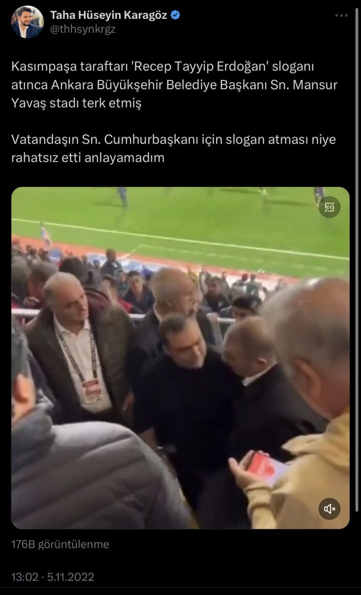 “Kasımpaşa taraftarı ‘Recep Tayyip Erdoğan’ sloganı atınca Ankara Büyükşehir Belediye Başkanı Sn. Mansur Yavaş stadı terk etmiş